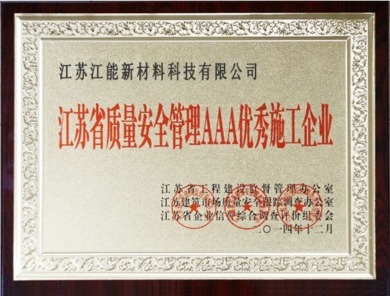 近日,江蘇江能新材料科技有限公司榮獲《江蘇省質量安全管理AAA優秀施工企業》稱號。這是江能在獲取諸多榮譽后又一殊榮。本獎項的獲得是社會各界對江能的肯定,表明我公司信用程度高,經營狀況佳,合同履約能力強,施工質量穩定、市場信譽好。