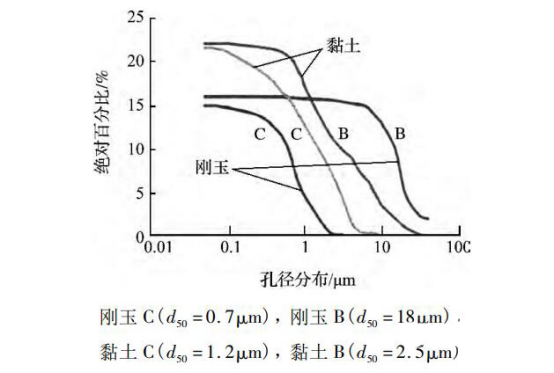 在選擇最佳的技術(shù)路線時(shí),無(wú)論對(duì)于不定形耐火材料還是燒成耐火制品,都可能獲得相近的密度。然而,產(chǎn)品的區(qū)別在于它們的結(jié)構(gòu)。對(duì)耐火澆注料而言,重點(diǎn)是控制混合物的流變性,這就是為什么要精細(xì)地控制顆粒的尺寸分布,并且使用超細(xì)粉甚至納米顆粒。不定形耐火材料的微孔結(jié)構(gòu)最為典型。在致密的燒成磚中,典型的氣孔尺寸為20~25μm,有些特殊的制品可達(dá)5μm。在澆注料中,即使經(jīng)過(guò)燒成,其氣孔的中位徑通常不超過(guò)1~2μm。兩種典型的耐火澆注料和耐火磚(黏土質(zhì)和高鋁質(zhì))的孔徑分布的對(duì)比。