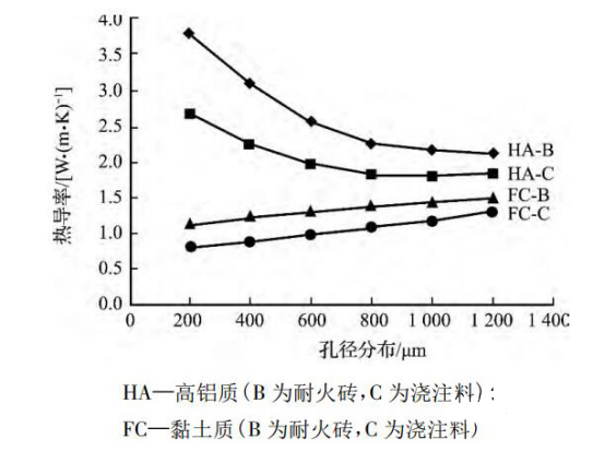 微孔結(jié)構(gòu)也導(dǎo)致材料在高溫下的熱輻射降低。與具有相似組成和氣孔的燒成耐火制品相比,澆注料的熱導(dǎo)率降低了20%~30%。如圖2所示。