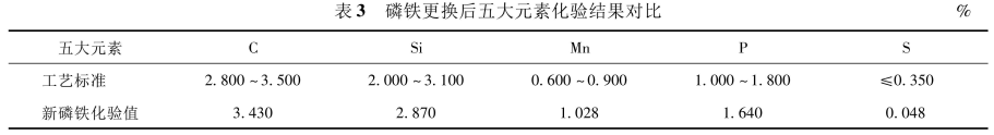 針對(duì)磷鐵成分中硫含量高出標(biāo)準(zhǔn)值4.5倍的問題,借鑒同行業(yè)做法,整體置換磷鐵,選用專業(yè)鐵合金公司配置標(biāo)準(zhǔn)磷鐵予以置換。經(jīng)過整體更換磷鐵后,五大元素完全符合工藝標(biāo)準(zhǔn)要求,見表3。鐵水流動(dòng)性得到很大改善,不但陽極澆鑄后磷鐵環(huán)平整、飽滿,外觀質(zhì)量得到根本性轉(zhuǎn)變,更重要的是鐵水出爐溫度只需1350℃即可滿足澆鑄需求,爐襯工作溫度大幅下降,爐齡得到保障,中頻爐爐齡平均為57天。