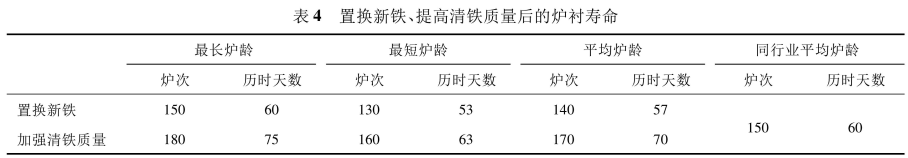 為了使更新的磷鐵成份保持長(zhǎng)周期穩(wěn)定,減少爐渣的產(chǎn)生,降低雜質(zhì)對(duì)爐壁的腐蝕,也為了提高陽極澆鑄質(zhì)量創(chuàng)造條件,在更新磷鐵后要堅(jiān)持對(duì)回爐鐵進(jìn)行清理后才能入爐熔煉。因?yàn)榛貭t鐵表面除了附著部分殘極碳粒,還有電解質(zhì),這些雜質(zhì)對(duì)爐襯來說都是有害元素,其中碳粒和石英砂在高溫下發(fā)生還原反應(yīng)(SiO2+2C=Si+2CO),而電解質(zhì)作為堿性物對(duì)酸性爐襯同樣具有腐蝕作用,從而破壞爐襯影響爐齡。通過提高磷鐵清理質(zhì)量,使?fàn)t齡在原有基礎(chǔ)上再次延長(zhǎng)10~15天,爐次增加30次,見表4。