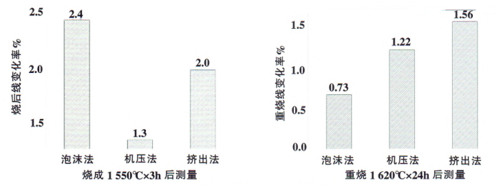 采用泡沫法制備的莫來石質隔熱耐火磚具有燒后線收縮率大而重燒線收縮率小的特點,其主要原因是其結構更加均勻,氣孔的孔徑分布呈現微-納米共存的兩極分布,燒結更加充分導致的。另一方面,采用機壓法制備的莫來石質隔熱耐火磚燒后線收縮率和重燒線收縮率均比以擠出法制備的要小,這主要是成型過程的受力方向不同所致。采用機壓法制備的樣品在燒成過程中會產生一定程度的膨脹。