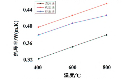 從圖4可以看出,在體積密度相同的情況下,采用泡沫法制備莫來石質隔熱耐火磚的導熱系數比采用機壓法或擠出法的更小。導熱系數與制品的氣孔率密切相關,氣孔率增加。增加了氣-固相界面,增大了固相導熱的聲子散射,進而降低了耐火材料的熱導;同時導熱系數還與氣孔孔徑密切相關,高溫條件下,氣體分子的運動加劇。其平均自由程因碰撞幾率加大而有所縮小,當氣體分子運動的平均自由程越接近于甚至大于該范圍內微孔的尺寸,氣孔內對流傳熱作用減弱,材料的熱導率出現降低。采用泡沫法制備的莫來石輕質隔熱磚的孔徑為微-納米級孔,其對流傳熱極大地降低,隔熱效果顯著提高。