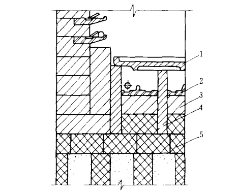 圖4 貫通式熱處理爐爐底的砌筑1-煙道;2-擋板磚;3-導軌磚;4-爐墻;5-噴嘴