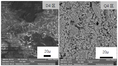 選取電極粉組及球瀝青組與炭黑組④區域相同部位制樣,分別記為“D4區”和“Q4區”。SEM結果如圖9所示:
