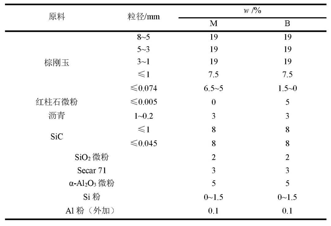 試驗原材料有:w(Al2O3)≥95%的棕剛玉骨料和細粉、w(Al2O3)≥59%的紅柱石微粉(≤0.005mm)、w(C)≥56%的球狀瀝青、w(SiC)≥97%的碳化硅顆粒和細粉、w(Al2O3)≥95%α-Al2O3微粉、SiO2微粉、鋁酸鈣水泥(Secar71)、w(Si)≥98%Si粉、w(Al)≥99%的金屬鋁粉。ASC澆注料的配比見表1。本試驗選用紅柱石微粉代替棕剛玉細粉,含紅柱石和不含紅柱石的澆注料分別記為B系列和M系列。Si粉加入量為00.5%1.0%1.5%時,不含紅柱石的試樣分別記為M1M2M3M4,含有紅柱石的試樣分別記為B1B2B3B4。按表1稱好的原料先在攪拌機中干混1min,再引入占干料質量(w)5%的水,濕混2min。在三聯模中振動成型為160mm×40mm×40mm的試樣,室溫下先養護24h后脫模,再于110℃下干燥24h后于1450℃保溫3h熱處理。ASC基質試樣的的配比見表2。本試驗選用紅柱石微粉代替棕剛玉細粉,含紅柱石和不含紅柱石的基質試樣分別記為B系列和M系列。Si粉加入量為04%7%10%時,不含紅柱石試樣分別標記為M1M2M3M4,含有紅柱石試樣分別標記為B1B2B3B4。按表1稱好的原料先干混1min,再引入水(水灰比為1:1),濕混2min。室溫下養護24h后脫模,再于110℃下干燥24h后于1450℃保溫3h熱處理。