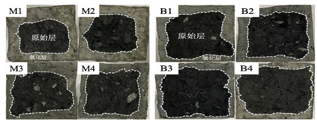 1 1450℃煅燒后及熱震10次后的澆注料試樣的橫截面圖