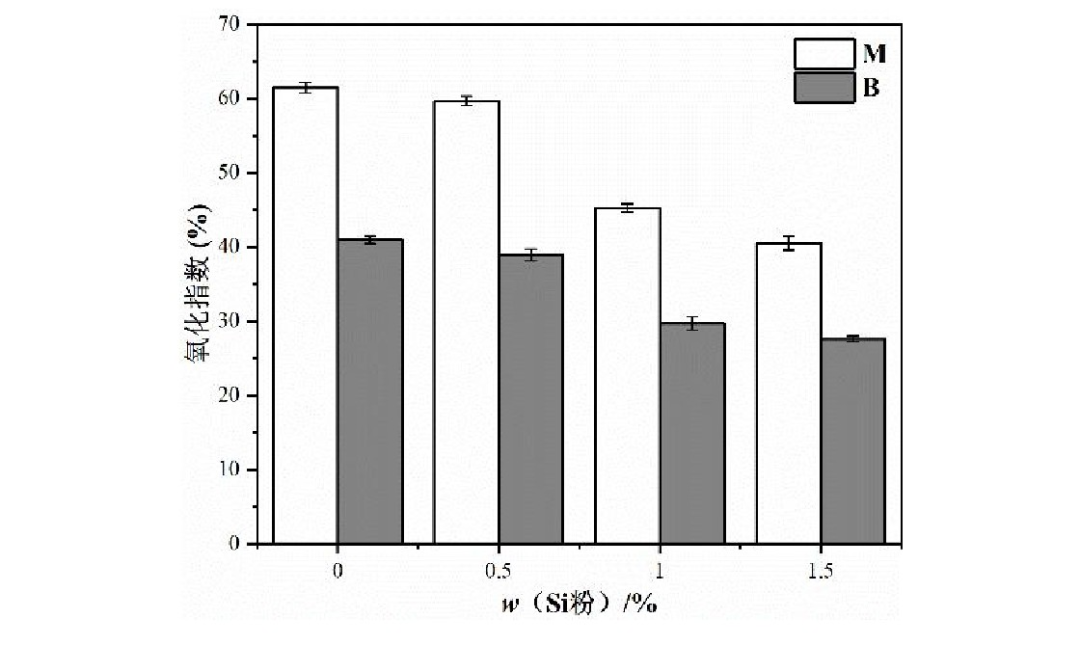試樣在1450℃煅燒之后及進行抗熱震測試10次之后的ASC澆注料的截面照片和氧化指數分別見圖1和圖2。圖1中黑色的區域表示未氧化的含碳層,灰色的區域表示氧化層。可見,不含紅柱石的M系列和含紅柱石的B系列,隨著Si粉含量的增加,試樣氧化層的面積逐漸減小,說明Si粉越多,抗氧化性越好。圖2中的氧化指數也印證了這一點。含紅柱石的B系列的氧化層面積總是小于相同Si粉含量的不含紅柱石的M系列,且試樣B2的氧化指數小于試樣M4的,說明引入適量的紅柱石微粉,即使低Si含量時澆注料也可以很好地提高澆注料的抗氧化性。