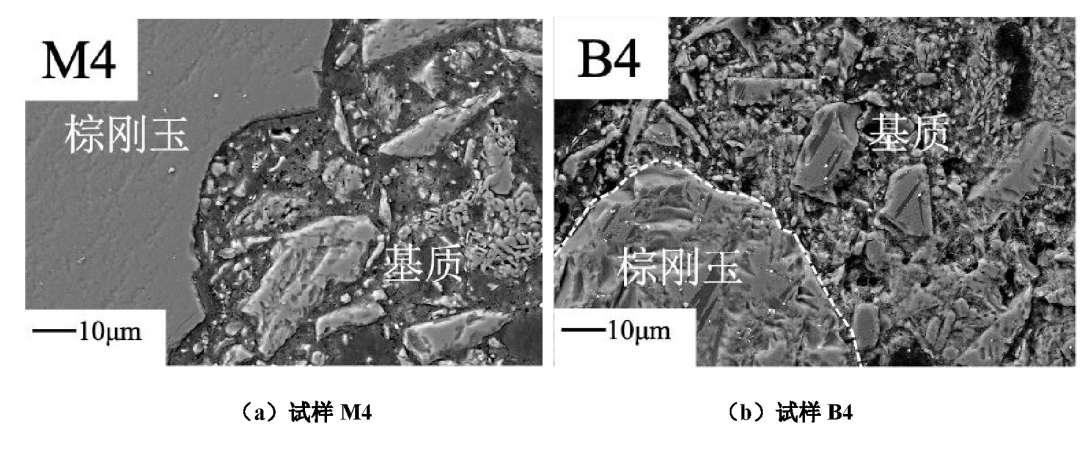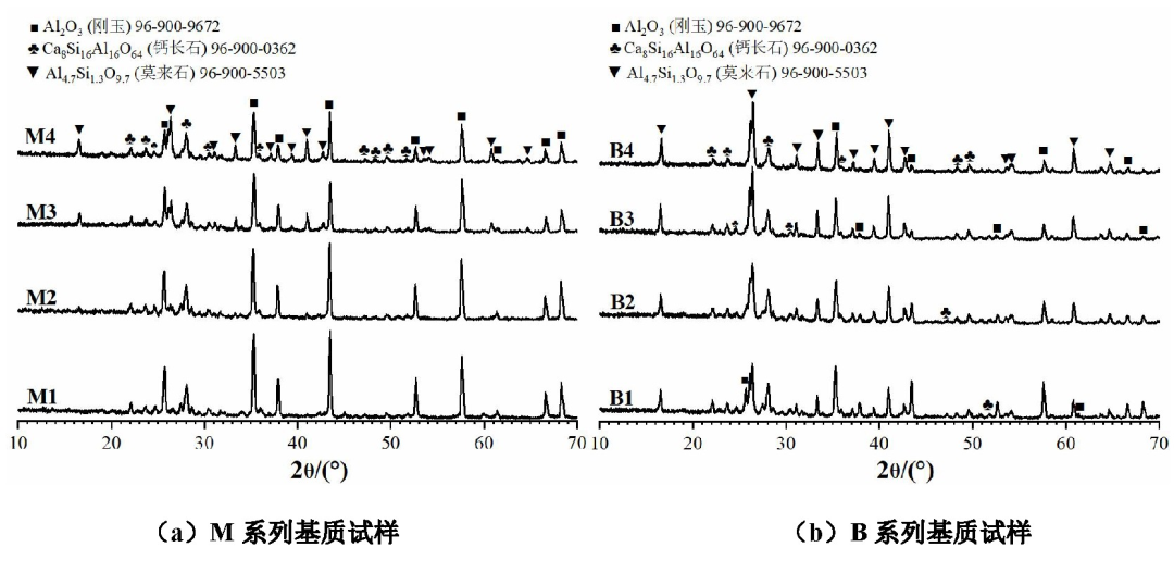 圖3為燒后基質試樣的XRD圖譜。因為澆注料中的紅柱石微粉含量很少,在澆注料的XRD中很難看出紅柱石微粉對其影響,所以實驗制作了澆注料所對應比例的基質試樣,用來表現澆注料中紅柱石微粉的影響。從圖3可知,M系列和B系列的基質試樣的物相主要為剛玉、鈣長石和莫來石。在相同的Si粉加入量下,含紅柱石的B系列試樣中的莫來石的峰明顯高于不含紅柱石的M系列。這是因為在1450℃下保溫3h后紅柱石微粉已經完全莫來石化,并且轉化生成的部分富硅玻璃相與基質中的Al2O3反應生成二次莫來石。從而使得含紅柱石的B系列試樣中的莫來石的含量高于不含紅柱石的M系列。