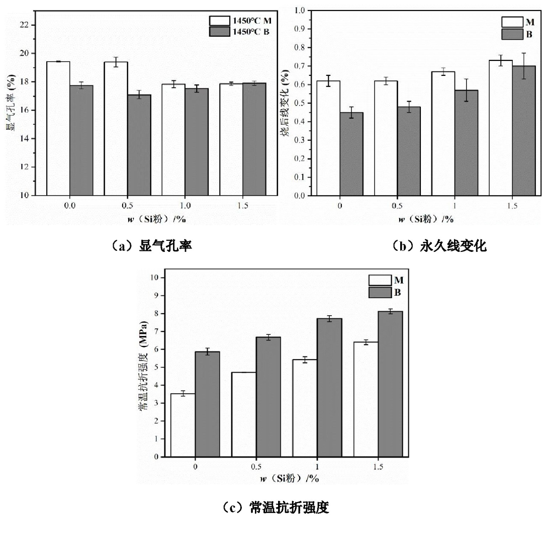 由圖4還可看出,隨Si粉添加量的增加,M系列試樣的顯氣孔率逐漸降低,B系列試樣的顯氣孔率先降低,再增加甚微,在Si粉加入0.5%(w)時最小;M系列和B系列試樣的線變化率和常溫抗折強度隨Si粉加入量增加而逐漸增加。因為Si粉被氧化后會生成一定量的SiO2液相,促進燒結并堵塞部分氣孔。