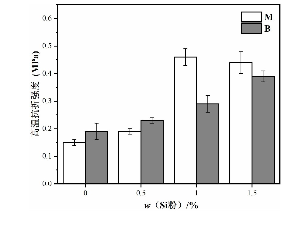 經1450℃燒后試樣的高溫抗折強度見圖6。隨Si粉添加量的增加,試樣的高溫抗折強度升高,當w(Si粉)≤0.5%時,含紅柱石的B系列試樣的高溫抗折強度高于M系列的。當w(Si粉)為1.0%1.5%時,B系列的高溫抗折強度反而明顯低于M系列的。說明當Si粉加入量少時,紅柱石帶來的二次莫來石化占主導,使得高溫抗折強度提高。但是Si粉添加超過0.5%(w),紅柱石產生的大量富硅玻璃相和Si粉被氧化后生成的液相占主導,使得B系列試樣的高溫抗折強度明顯低于M系列。這也說明加入適量的紅柱石微粉在降低金屬硅含量的情況下,不僅不降低澆注料的抗氧化性,而且對其高溫抗折強度也有積極影響。