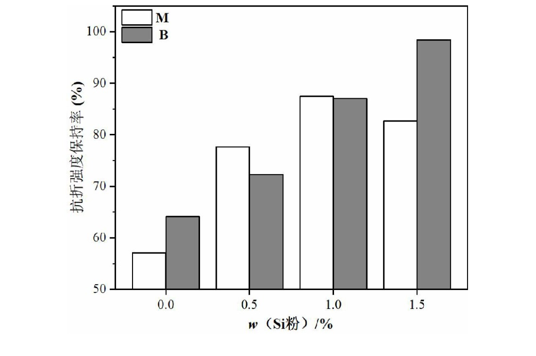 試樣在950℃下熱震10次后的抗折強度保持率見圖7。可見,隨著Si粉添加量的增加,常溫抗折強度增加(見圖4(c)),抗熱震性改善。當w(Si粉)=1.5%時,含紅柱石微粉的B系列的抗折保持率要遠高于不含紅柱石微粉的M系列,因為澆注料的抗氧化性有明顯提高的同時,更多的SiCC被保留下來(見圖1),因此澆注料的抗熱震性能,隨著抗氧化性能的提高而改善。不僅如此紅柱石微粉所產生的富硅玻璃相和二次莫來石(見圖3),可以吸收部分的熱應力提高韌性,進而提高了抗熱震性。