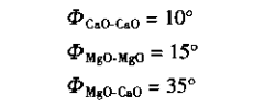 MgO-CaO質耐火材料應用于煉鋼爐子中作內襯時,通常都希望含有相對較高的CaO。在MgO-CaO-熔體系中,異晶間的頸處形成的二面角Φ比同晶間頸處所形成的二面角Φ大得多,如: