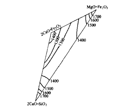 使MgO-CaO系統的最低共熔點溫度由2300℃迅速下降到1320℃,如圖3-7所示。雖然這種液相能夠有效地促進MgO-CaO質耐火材料的燒結,但它是穩定的液相,會明顯降低該材料的抗侵蝕性。這就說明,MgO-CaO-FeOn質混合料中應嚴格限制Al₂O₃含量。對于優質堿性耐火混合料來說,Al₂O₃含量通常應限制在0.5%以下。