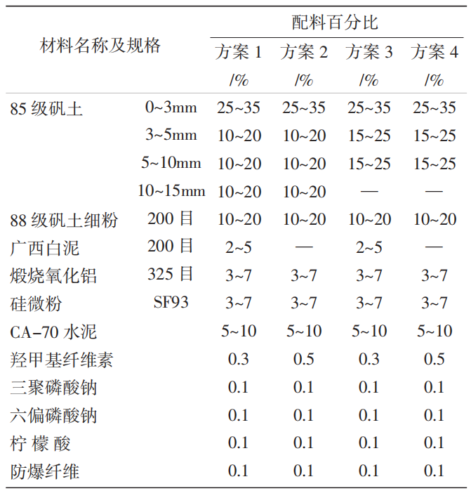 普通的澆注料一般由0~15mm的高鋁骨料60%~70%,細粉10%~25%,硅微粉3%~7%,氧化鋁粉3%~7%,高鋁水泥結合劑5%~15%,配以三聚磷酸鈉和六偏磷酸鈉作為減水劑,加水攪拌后進行澆注作業。為消除泵送過程中不不利因素,本試驗在普通澆注料的基礎上作了一些改進。一方面是調整了顆粒級配,同時添加了增稠劑,使澆注料的粘度增加,保證泵送過程中顆粒和粉料不分離;另外一面添加了緩凝劑,延長澆注料的凝固時間,保證泵送過程中不發熱凝固。試驗過程中同時對每一種原料都制定了嚴格的質量要求。理化指標見表1。